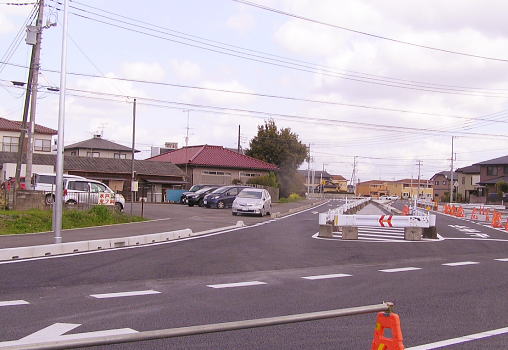 ●マップのB地点から北のA地点方向を見る。前方200m先が、国道50号との交差点・A地点です。片側2車線のうち、当面は1車線で共用しています。当駐車場(左)は、この道路から直接に入れるようになりました。 |